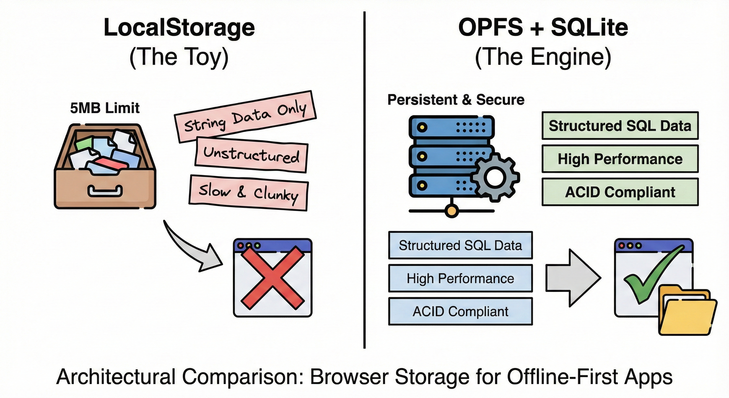 The standard way to build this app would be to use localStorage or IndexedDB. These are the "toys" of the browser world. They are fine for saving a user's dark mode preference, but they are terrifying places to store critical business data. They are unstructured, limited in size, and can be wiped by the browser on a whim.